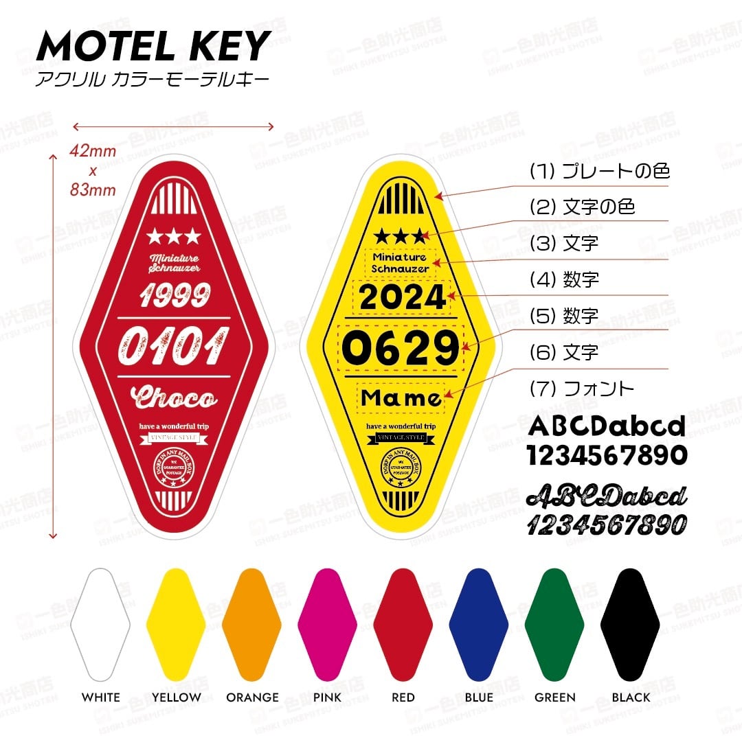 アクリルにカラーで印刷されたモーテルキーです